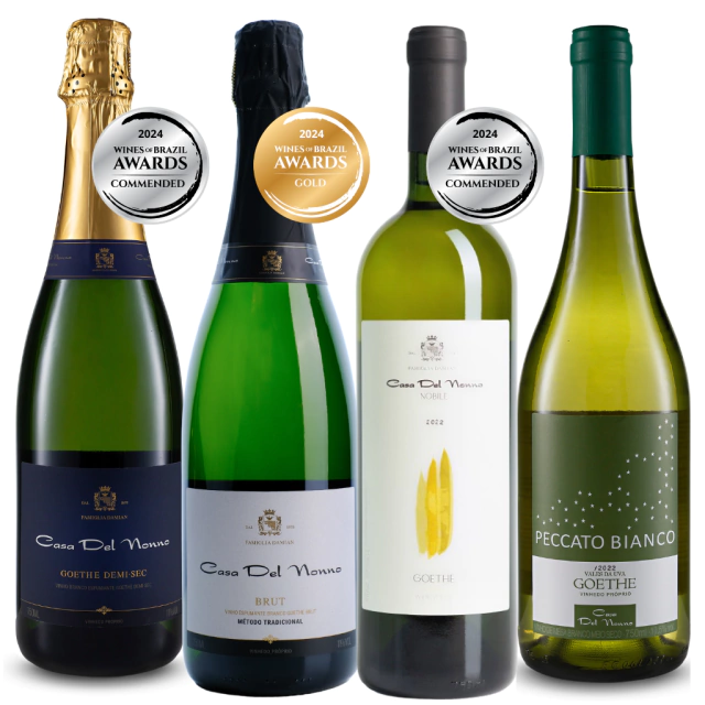 Nesta seleção especial da Casa Del Nonno você poderá experimentar a versatilidade e tipicidade dos vinhos elaborados com a Uva Goethe. De ampla característica organoléptica, a Uva Goethe oferece aromas, dulçor e acidez necessária para formularmos vinhos de altíssima qualidade, complexidade e tipicidade, sejam eles vinhos tranquilos ou espumantes. Aproveite essa seleção para mergulhar na raridade e exclusividade dos vinhos Goethe da Casa Del Nonno!